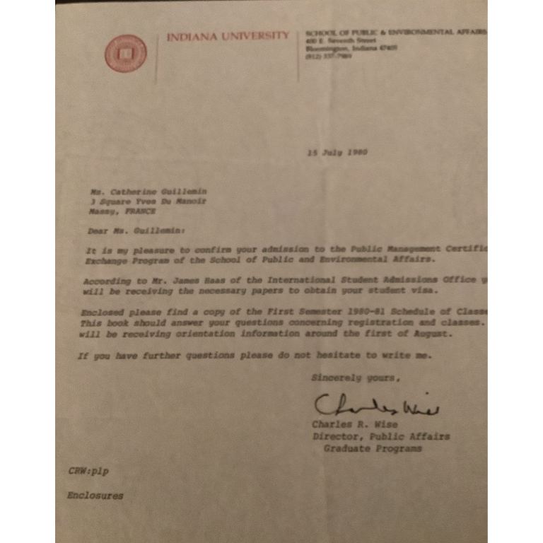 Where is Indiana? It was my first question when I listened to Prof. Charlie Wise talk about the School of Public and Environmental Affairs, Indiana University, and Bloomington in May 1980. He was recruiting students from Paris Sud Law School to launch an exchange program between the two schools. I became the first of those students. At first, I was set to earn a Certificate in Public Management. I ended up graduating with a Master of Public Affairs in 1982. My husband, David, who also earned a Certificate in Public Management, worked in the school’s placement office from 1982–83 with Jack Merritt. While a graduate student, I was asked to create a student guide for incoming French students. I was one of the first employees of the Indiana Department of Environmental Management. Leadership positions in health consulting, not-for-profit, and philanthropy management at Mayo Clinic followed. I am now teaching the French language to proficient learners. What started as a one-year experiment at IU became a lifelong adventure, and I am very grateful for the opportunity I received 42 years ago.